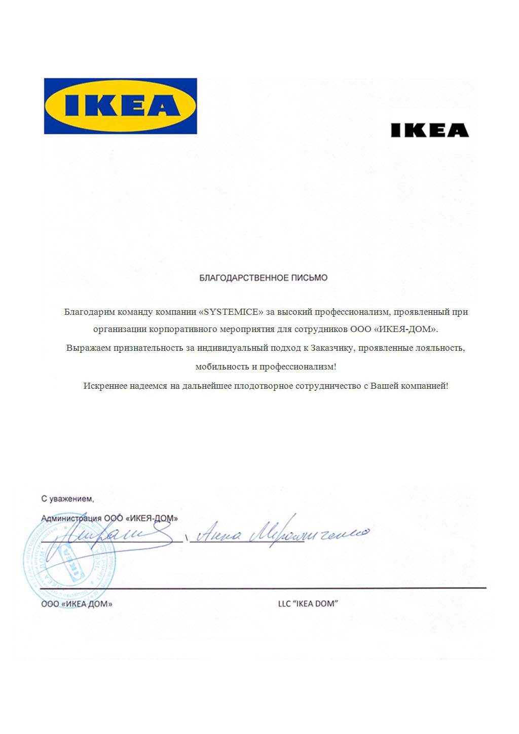 Благодарим команду компании «SYSTEMICE» за высокий профессионализм, проявленный при организации корпоративного мероприятия для сотрудников ООО «ИКЕЯ-ДОМ».